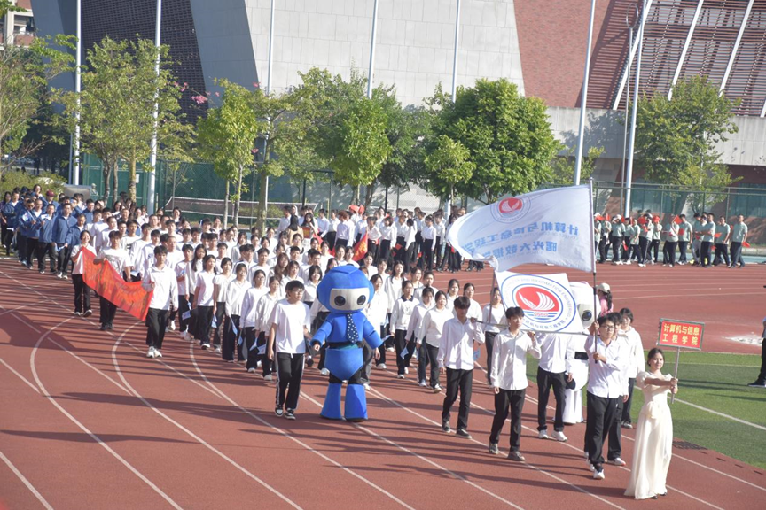 师生挥动着手中的院旗,迈着整齐、有力的步伐,喊着激扬的口号走过主席台,展现出计信学子热情饱满的精神风貌。